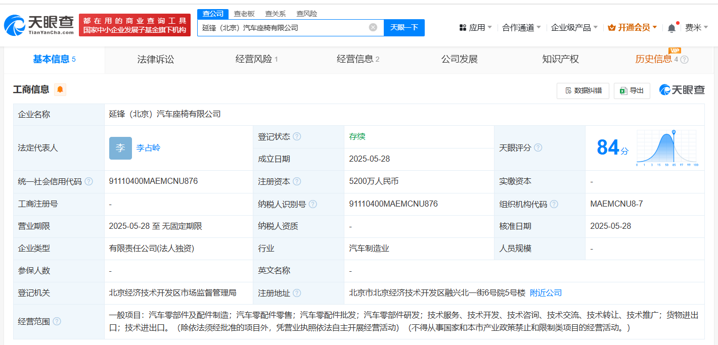 南方财经6月4日电,天眼查App显示,近日,延锋(北京)汽车座椅有限公司成立,法定代表人为李占岭,注册资本5200万人民币,经营范围包括汽车零部件及配件制造、汽车零配件零售、汽车零配件批发、汽车零部件研发、货物进出口、技术进出口等,由华域汽车(600741)旗下延锋国际座椅系统有限公司全资持股。