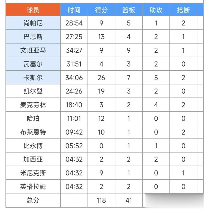 哈珀12分、凯尔登19分3板、巴恩斯13分4板、卡斯尔26分7板5助、尚帕尼9分5板、瓦塞尔4分3板、文班亚马9分9板2助4帽。