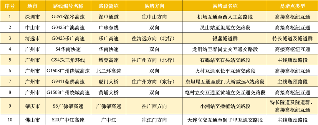 经广东省公安厅交通管理局与省交通运输厅联合研判,今年我省中秋国庆假期里较为拥堵的路段、收费站、车流较饱和服务区,以及充电设施利用率高的服务区有以下这些: